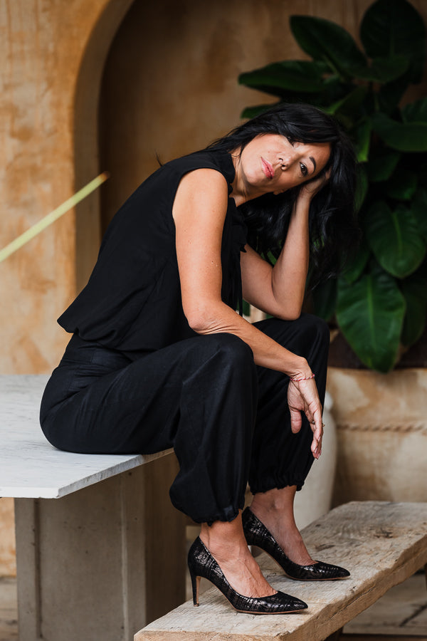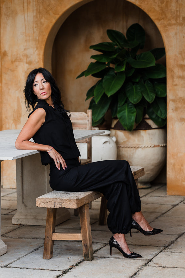 Featuring a clean structured wide waistband and adjustable drawstring ties at the ankles, they allow for personalised styling - wear them loose for a relaxed wide-leg or cinched in for a tapered ballooned finish.